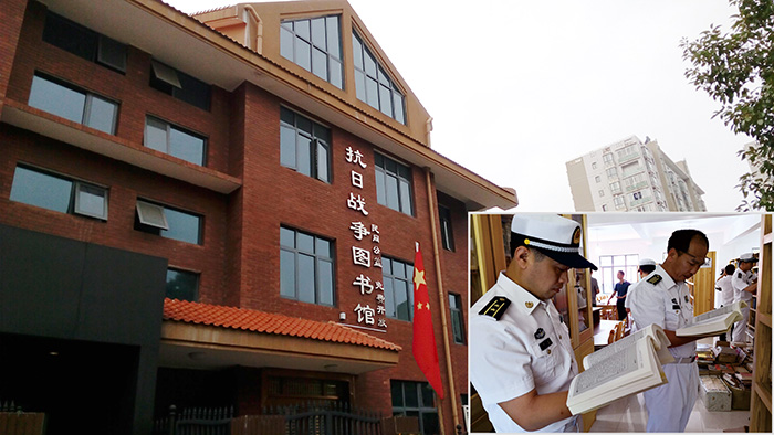 湖南炎德文化實業(yè)有限何譽(yù)軍創(chuàng)建的抗日戰(zhàn)爭圖書館。右下圖為海軍某部官兵到抗日戰(zhàn)爭圖書館參觀學(xué)習(xí)。