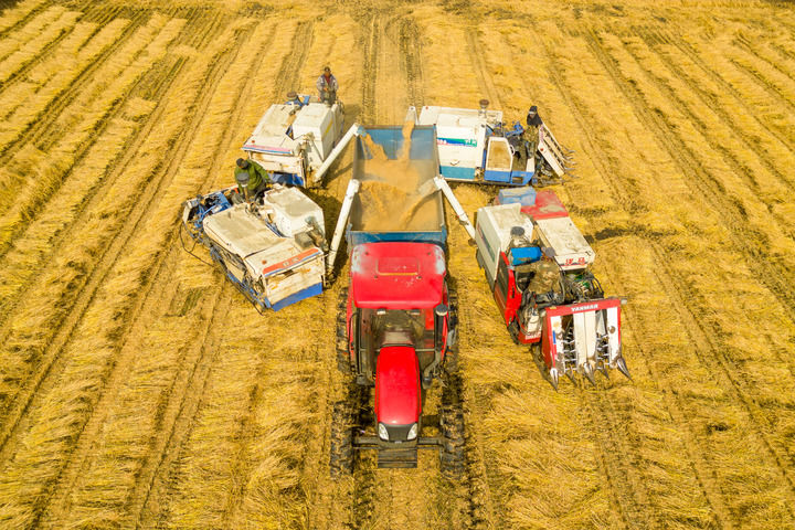 2024年10月13日,在黑龍江省綏化市北林區(qū)雙河鎮(zhèn)稻香村,村民駕駛農機進行卸糧作業(yè)(無人機照片)。(新華社記者 張濤/攝)
