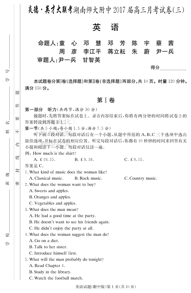 【英語】炎德英才大聯(lián)考2017師大附中高三3次月考
