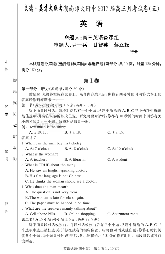 【英語(yǔ)】炎德英才大聯(lián)考2017師大附中高三5次月考