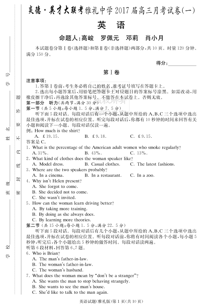 【英語】炎德英才大聯(lián)考2017雅禮中學(xué)高三1次月考