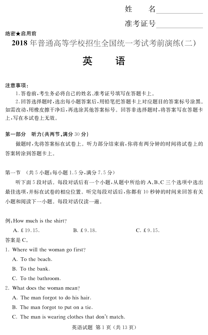 【英語】2018年普通高等學(xué)校招生全國統(tǒng)一考試考前演練(二)
