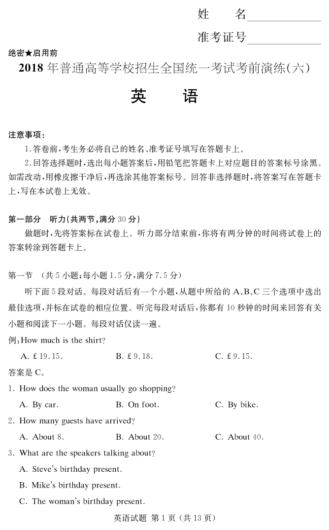 【英語】2018年普通高等學(xué)校招生全國統(tǒng)一考試考前演練(六)