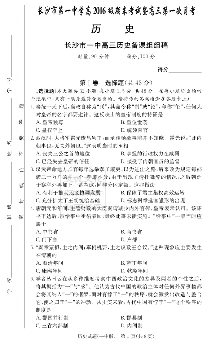 【歷史】炎德英才大聯(lián)考2019長(zhǎng)沙一中高三1次月考