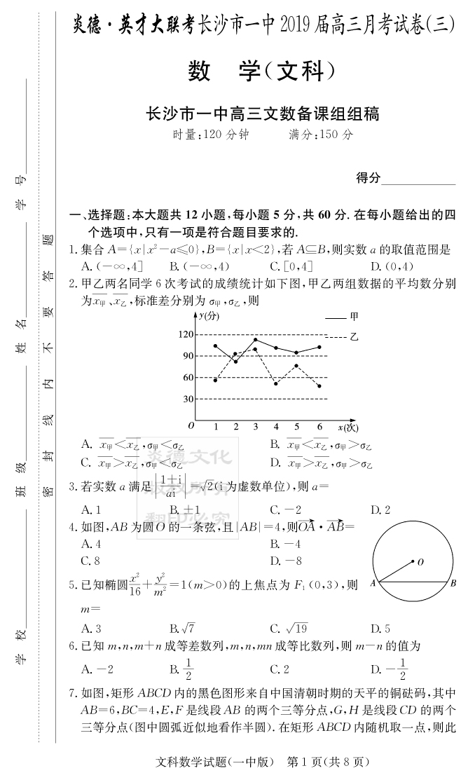 【文數(shù)】炎德英才大聯(lián)考2019長沙一中高三3次月考