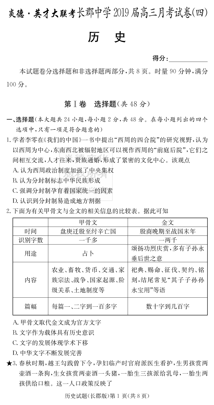 【歷史】炎德英才大聯(lián)考2019長(zhǎng)郡中學(xué)高三4次月考