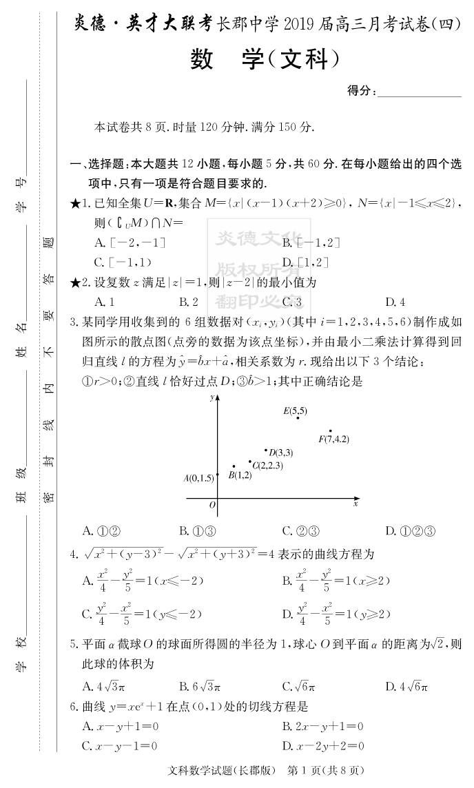 【文數(shù)】炎德英才大聯(lián)考2019長(zhǎng)郡中學(xué)高三4次月考