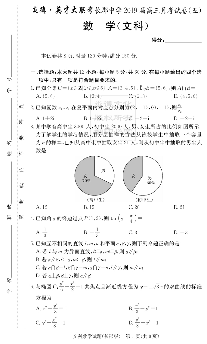 【文數(shù)】炎德英才大聯(lián)考2019長(zhǎng)郡中學(xué)高三5次月考