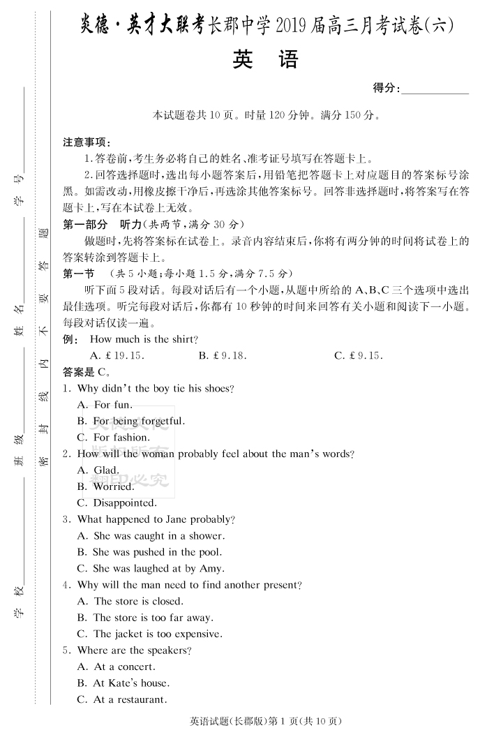 【英語(yǔ)】炎德英才大聯(lián)考2019長(zhǎng)郡中學(xué)高三6次月考