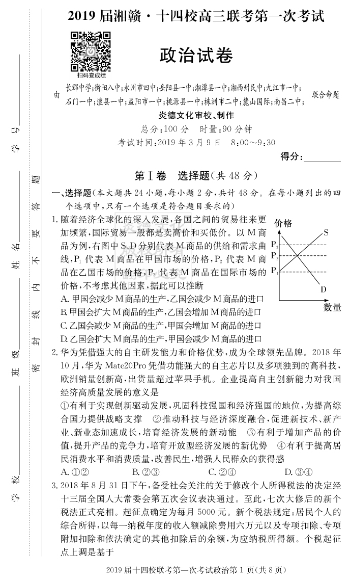 【政治】炎德英才大聯(lián)考2019長郡中學(xué)高三7次月考(十四校聯(lián)考一)