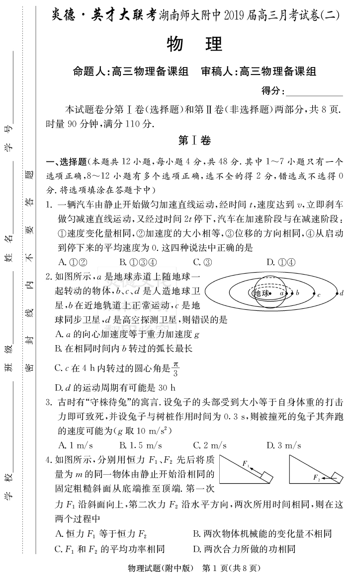 【物理】炎德英才大聯(lián)考2019師大附中高三2次月考
