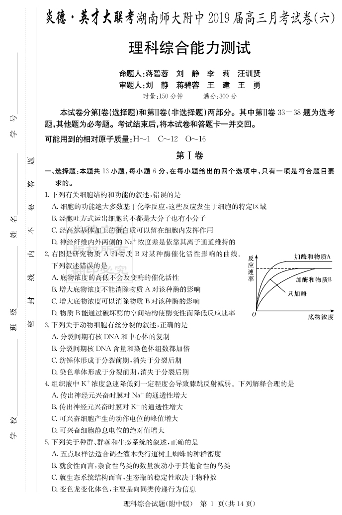 【理綜】炎德英才大聯(lián)考2019師大附中高三6次月考