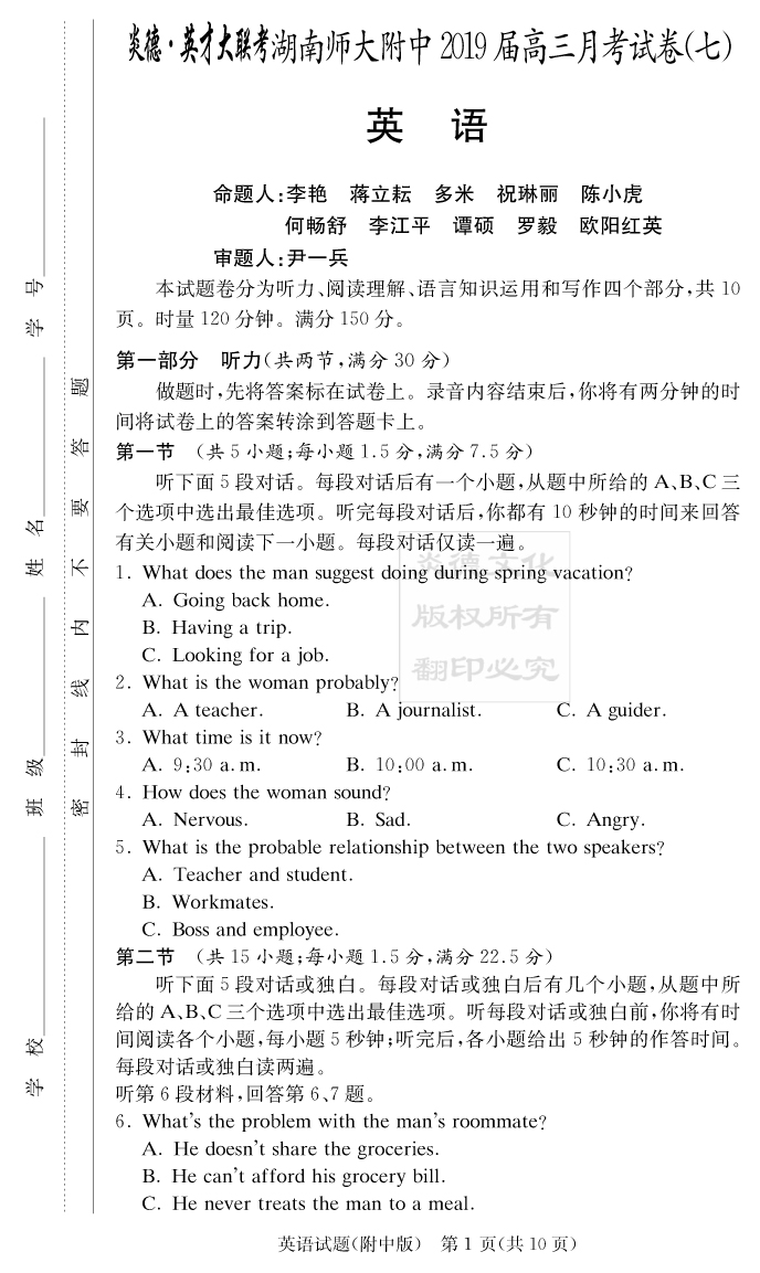 【英語】炎德英才大聯(lián)考2019師大附中高三7次月考