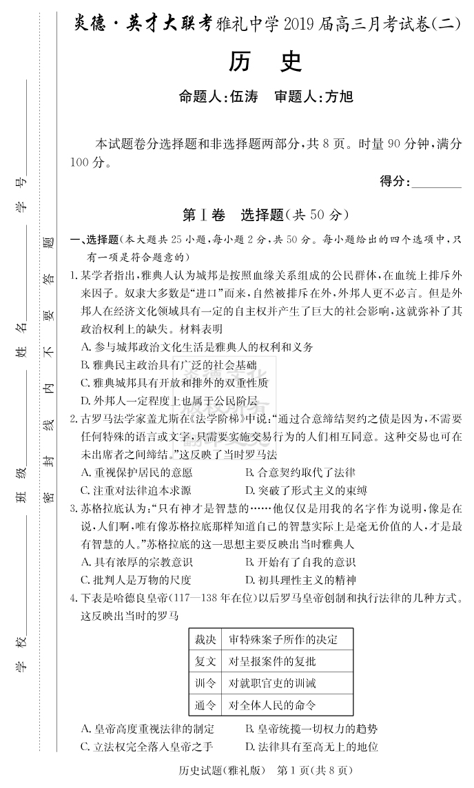 【歷史】炎德英才大聯(lián)考2019雅禮中學(xué)高三2次月考