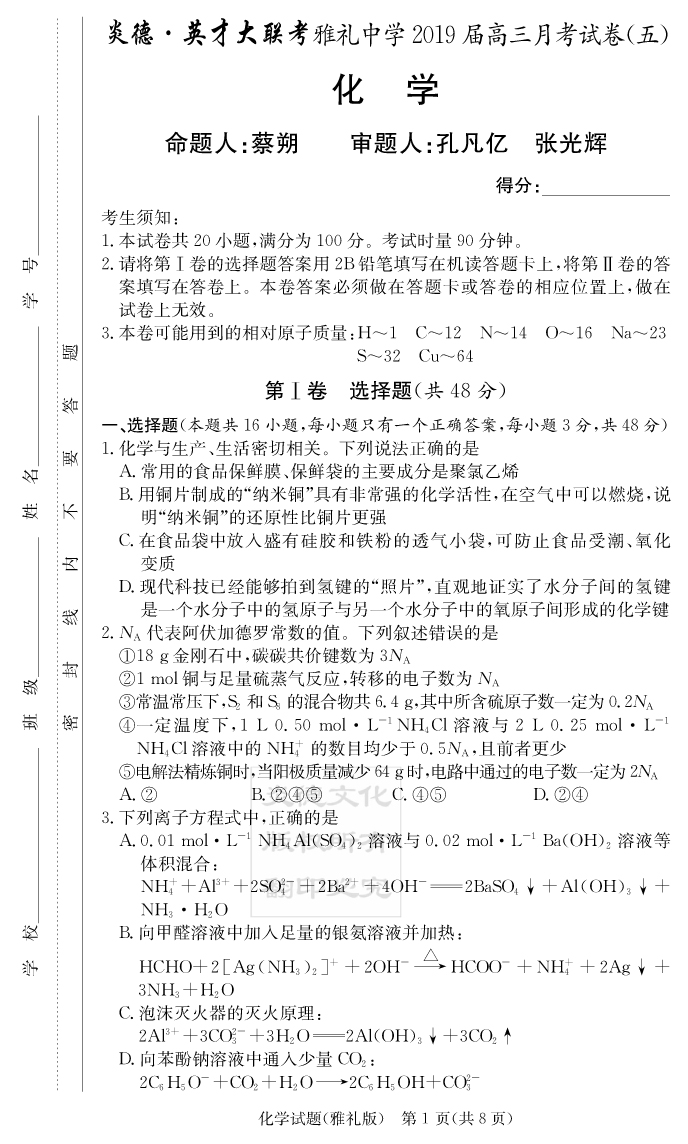 【化學(xué)】炎德英才大聯(lián)考2019雅禮中學(xué)高三5次月考