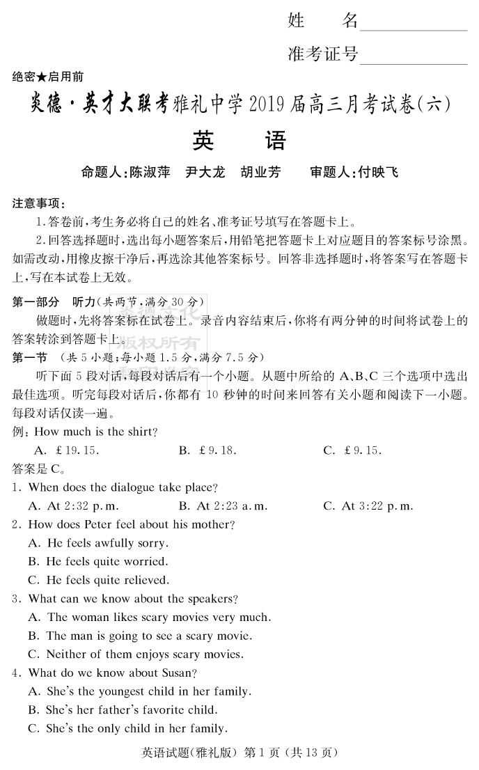 【英語】炎德英才大聯(lián)考2019雅禮中學(xué)高三6次月考