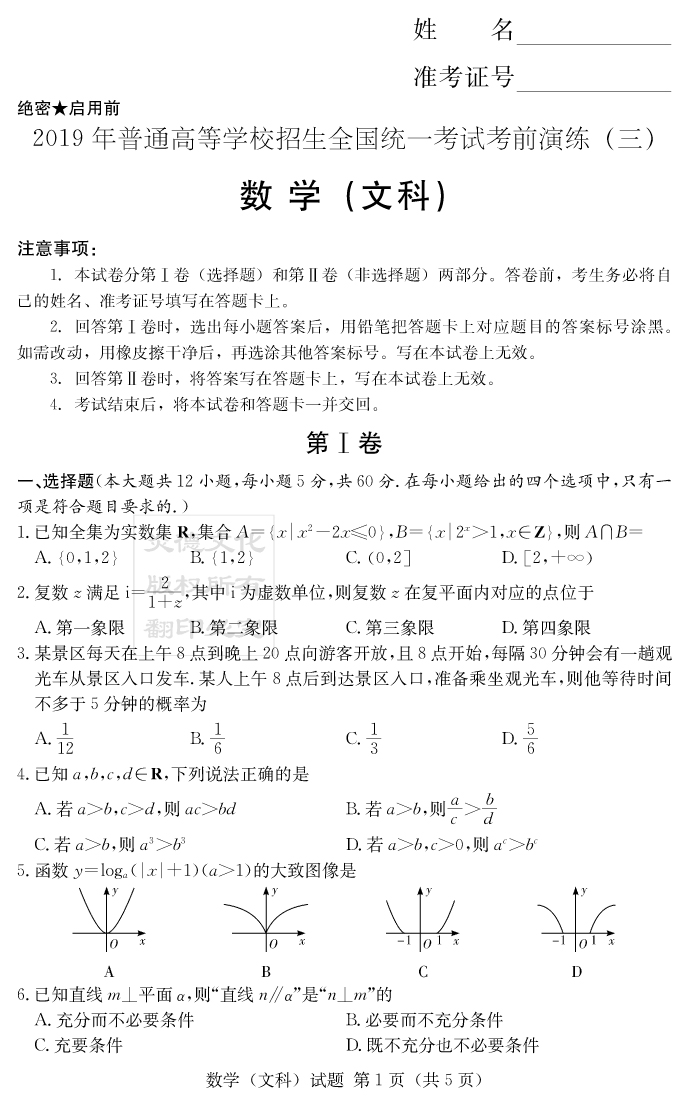 【文數(shù)】2019年普通高等學(xué)校招生全國統(tǒng)一考試考前演練(三)