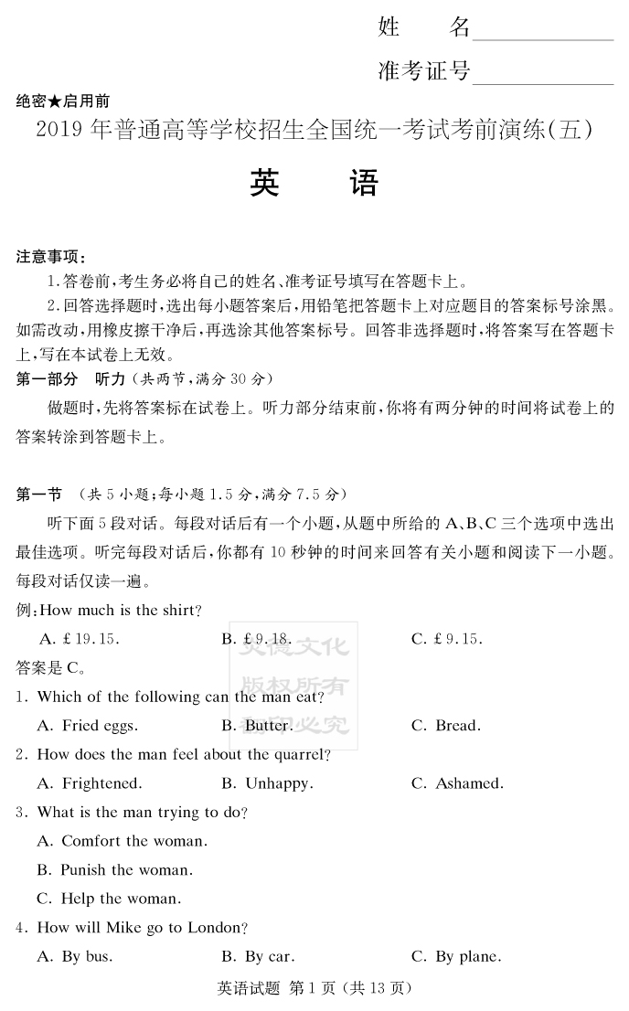 【英語(yǔ)】2019年普通高等學(xué)校招生全國(guó)統(tǒng)一考試考前演練(五)