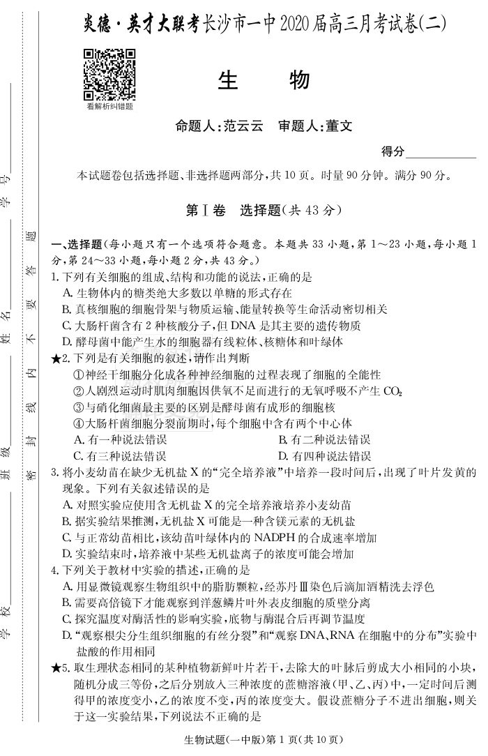 【生物】炎德英才大聯(lián)考2020屆長(zhǎng)沙市一中高三2次月考