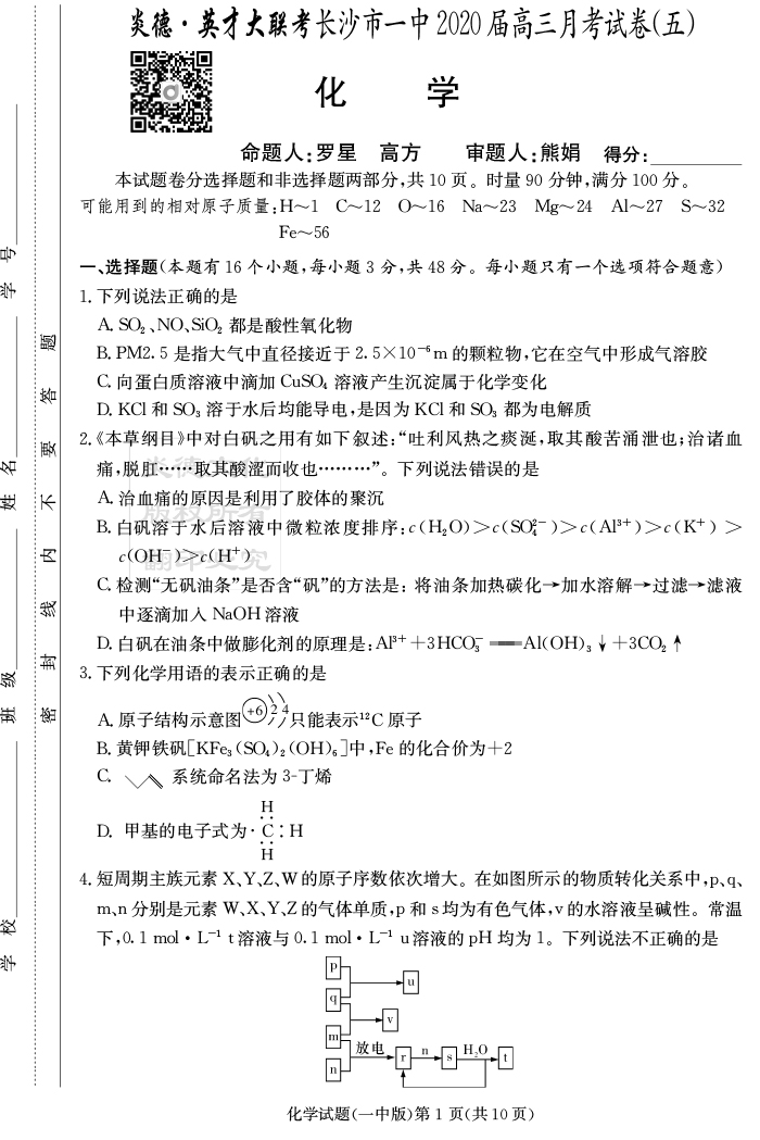 【化學(xué)】炎德英才大聯(lián)考2020屆長沙市一中高三5次月考