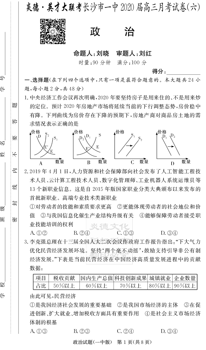 【政治】炎德英才大聯(lián)考2020屆長(zhǎng)沙市一中高三6次月考