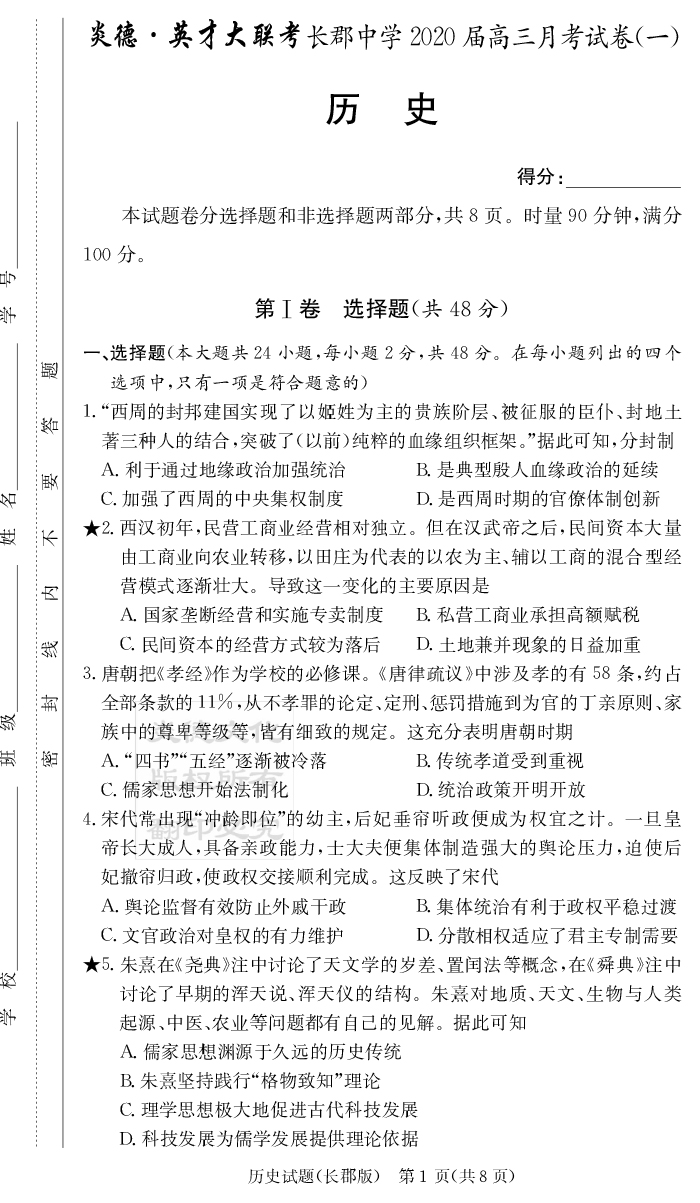 【歷史】炎德英才大聯(lián)考2020屆長郡中學(xué)高三1次月考