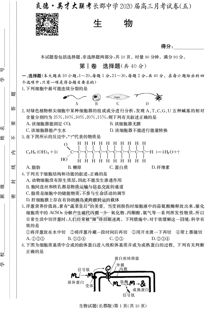 【生物】炎德英才大聯(lián)考2020屆長郡中學(xué)高三5次月考