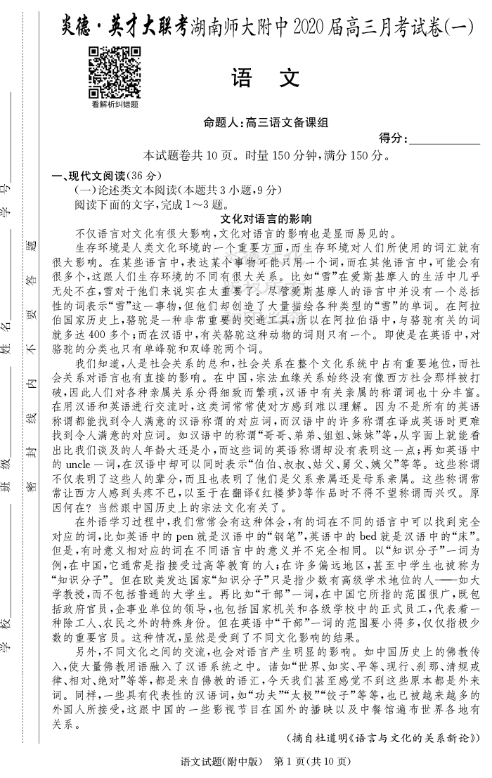 【語文】炎德英才大聯(lián)考2020屆師大附中高三1次月考