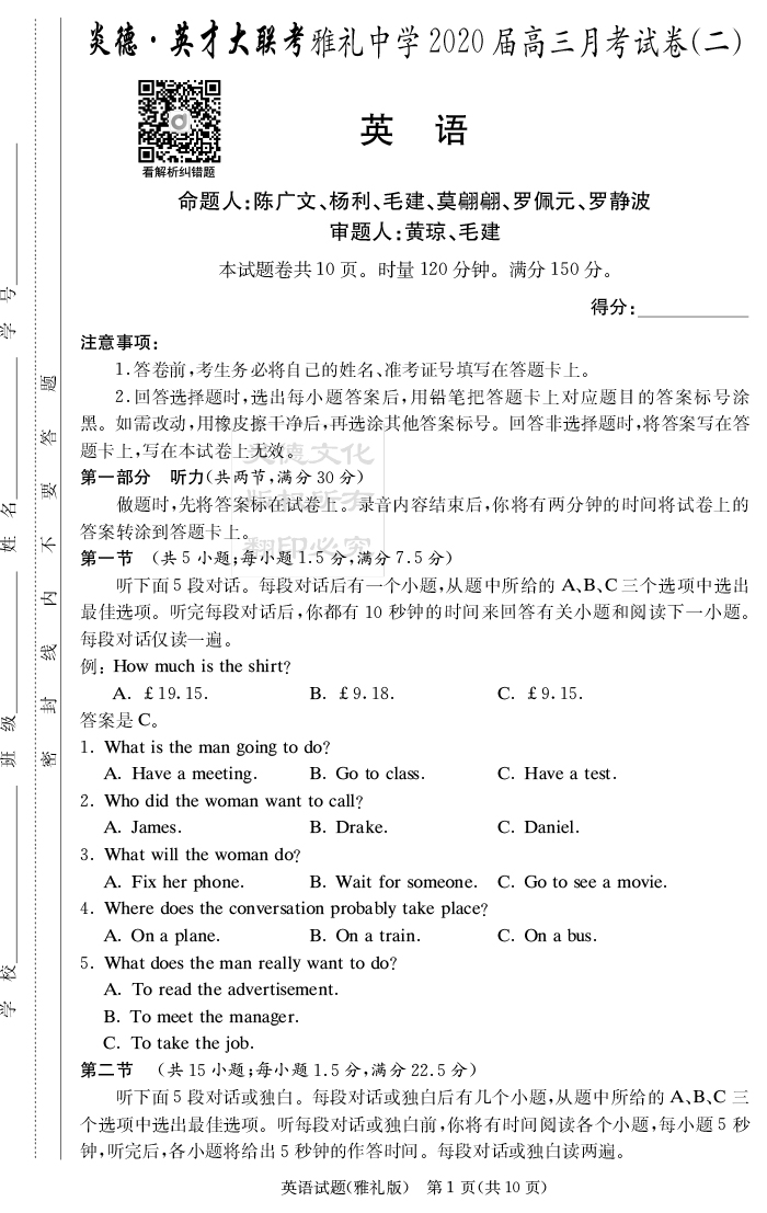 【英語】炎德英才大聯(lián)考2020屆雅禮中學(xué)高三2次月考