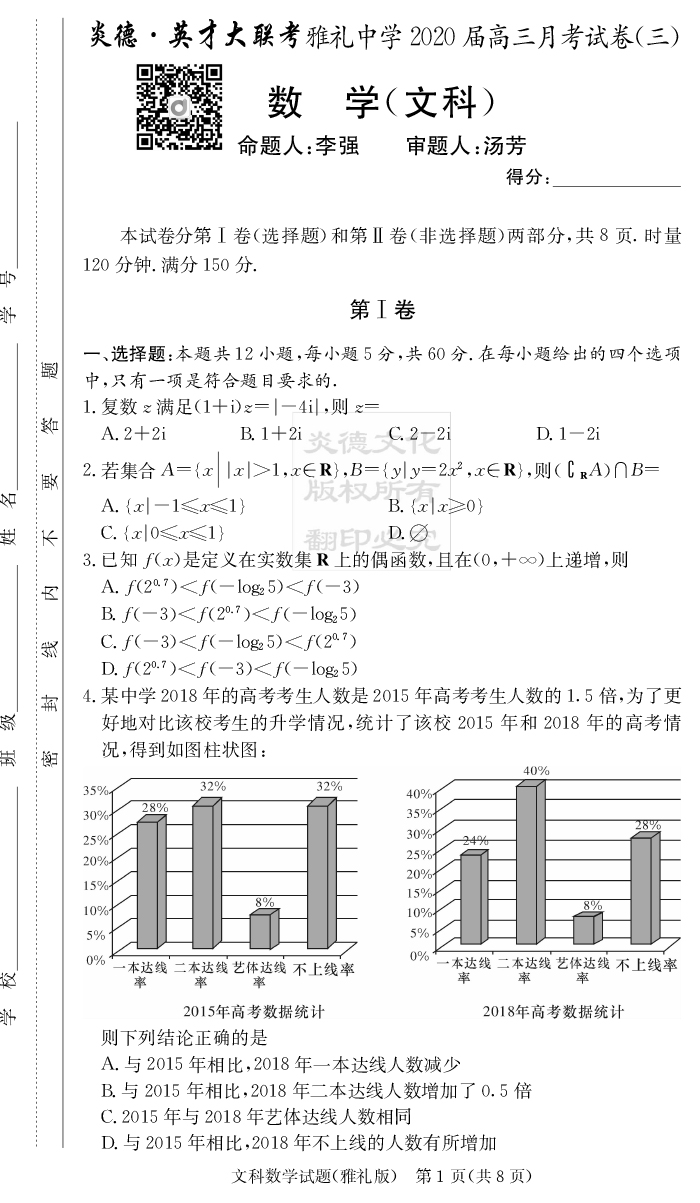 【文數(shù)】炎德英才大聯(lián)考2020屆雅禮中學(xué)高三3次月考