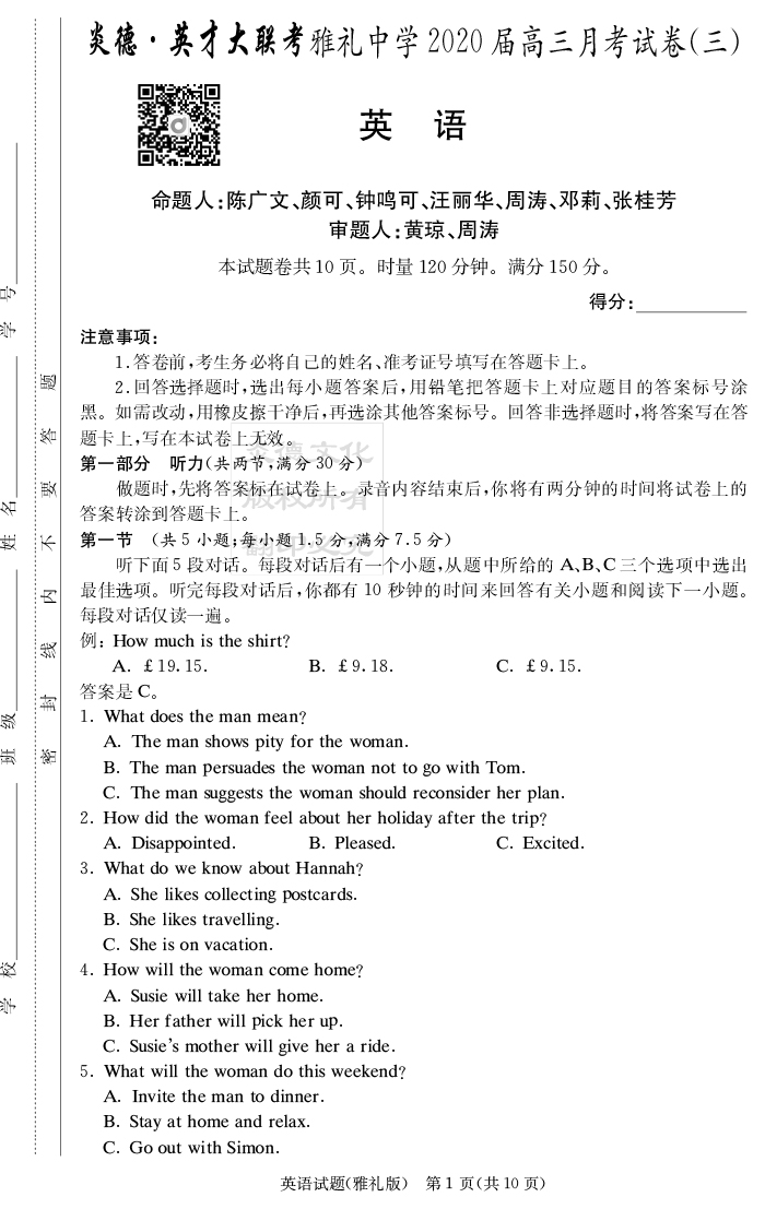 【英語】炎德英才大聯(lián)考2020屆雅禮中學(xué)高三3次月考