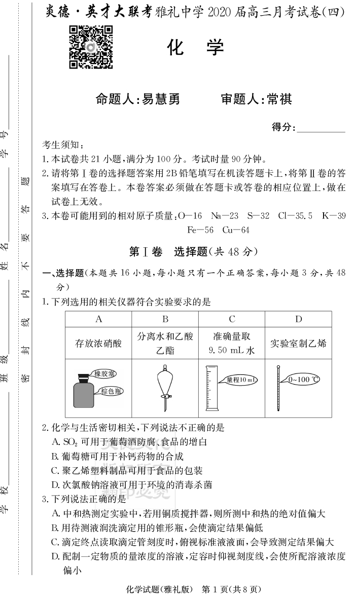 【化學(xué)】炎德英才大聯(lián)考2020屆雅禮中學(xué)高三4次月考