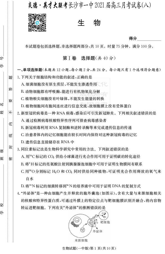 【生物】炎德英才大聯(lián)考2021屆長沙市一中高三8次月考