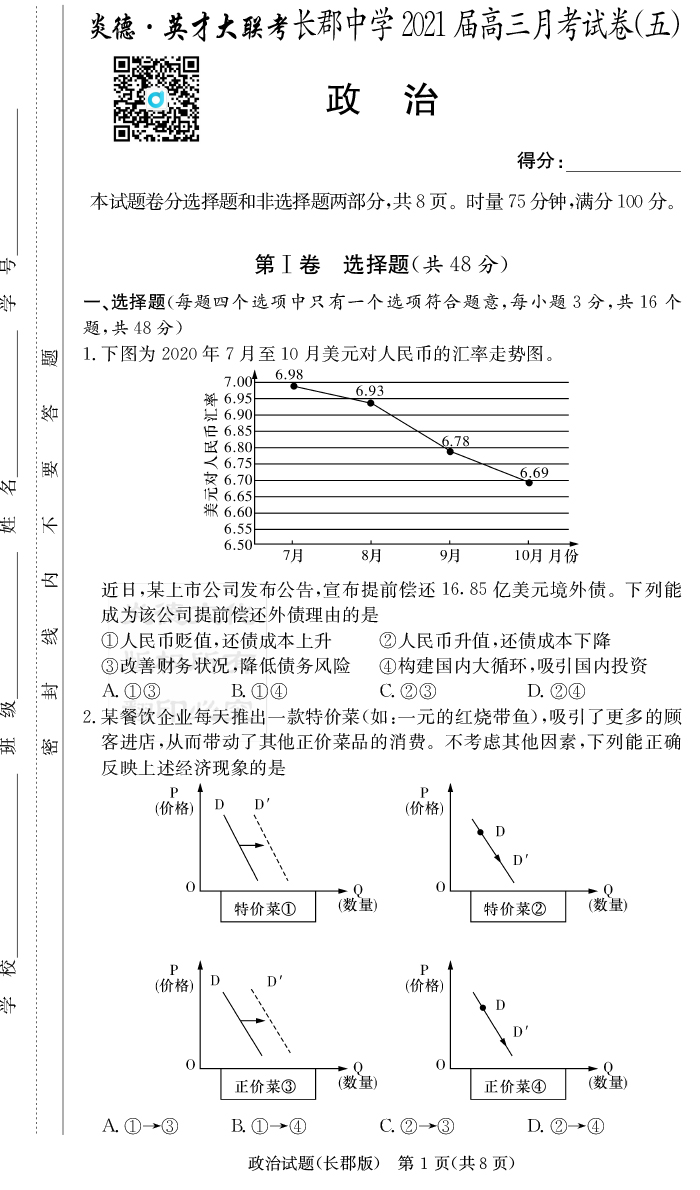 【政治】炎德英才大聯(lián)考2021屆長郡中學(xué)高三5次月考