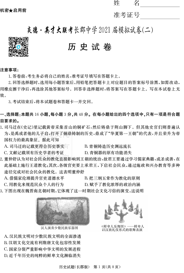 【歷史】炎德英才大聯(lián)考2021屆長郡中學(xué)高三10次月考(模擬二)