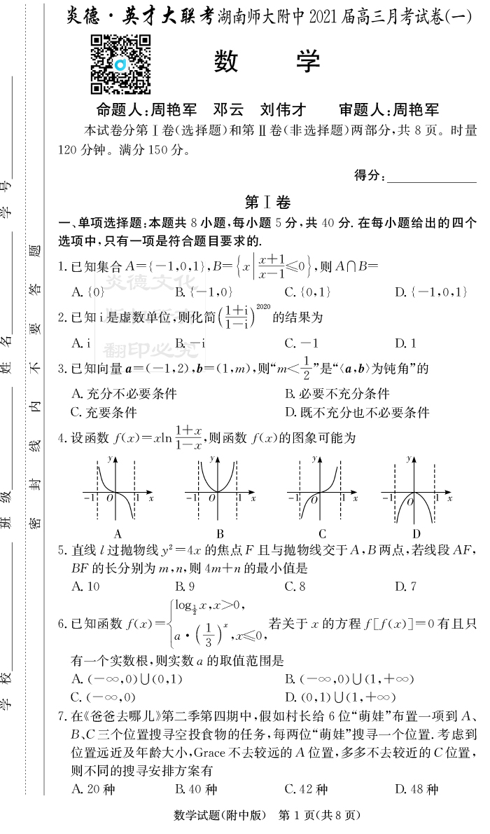 【數(shù)學(xué)】炎德英才大聯(lián)考2021屆湖南師大附中高三1次月考