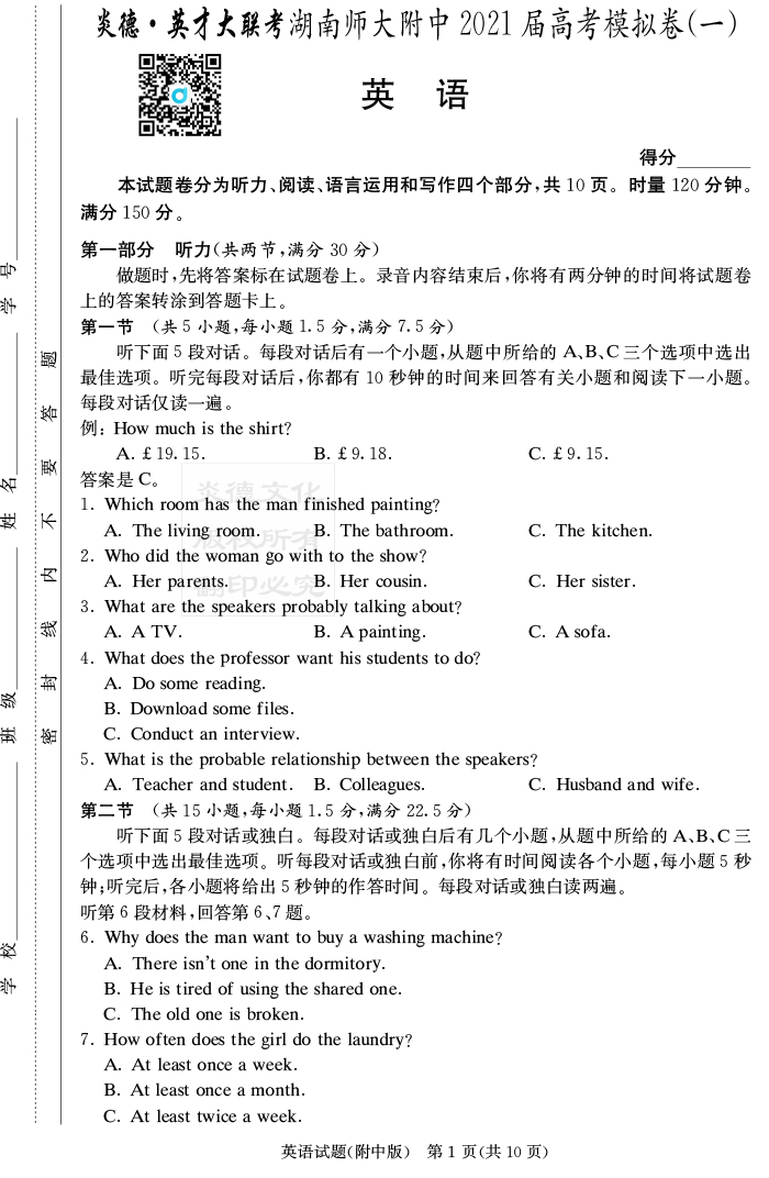【英語(yǔ)】炎德英才大聯(lián)考2021屆湖南師大附中高三8次月考(模擬一)