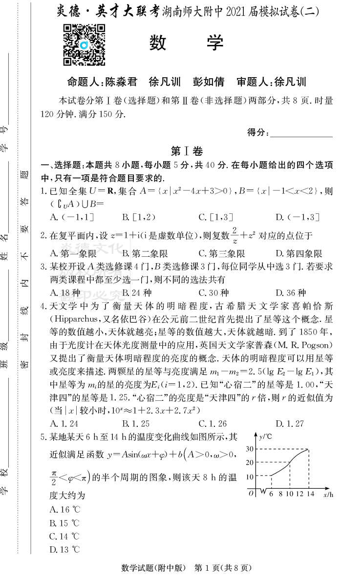 【數(shù)學(xué)】炎德英才大聯(lián)考2021屆湖南師大附中高三9次月考(模擬二)