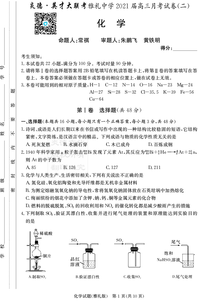 【化學(xué)】炎德英才大聯(lián)考2021屆雅禮中學(xué)高三2次月考