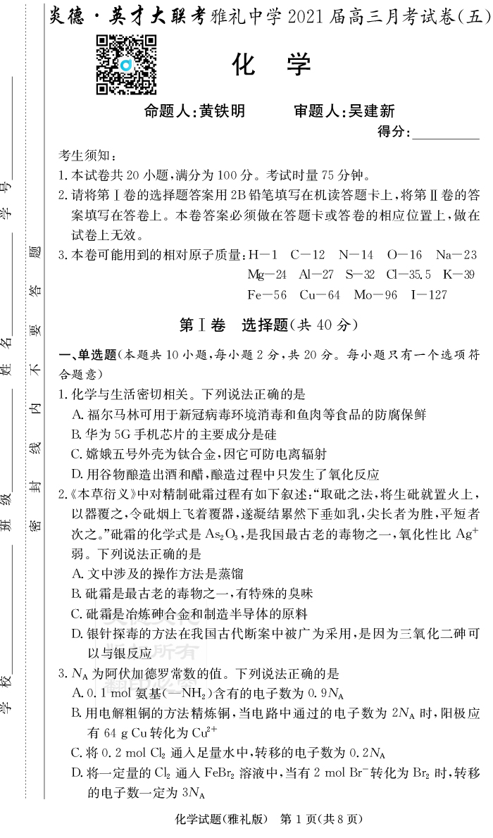 【化學(xué)】炎德英才大聯(lián)考2021屆雅禮中學(xué)高三5次月考