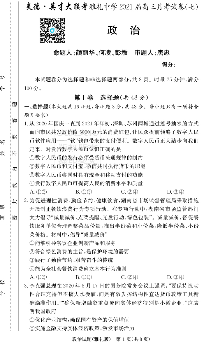 【政治】炎德英才大聯(lián)考2021屆雅禮中學(xué)高三7次月考
