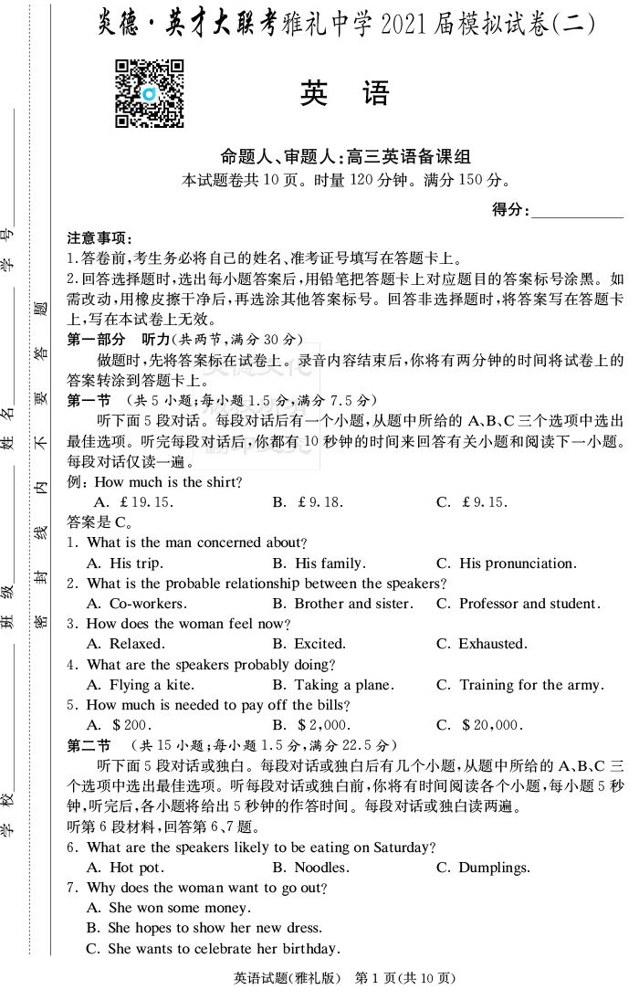 【英語】炎德英才大聯(lián)考2021屆雅禮中學(xué)高三10次月考(模擬二)
