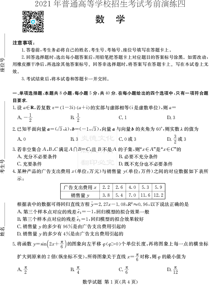 下一篇:【物理】2021年普通高等學校招生全國統(tǒng)一考試考前演練(四)