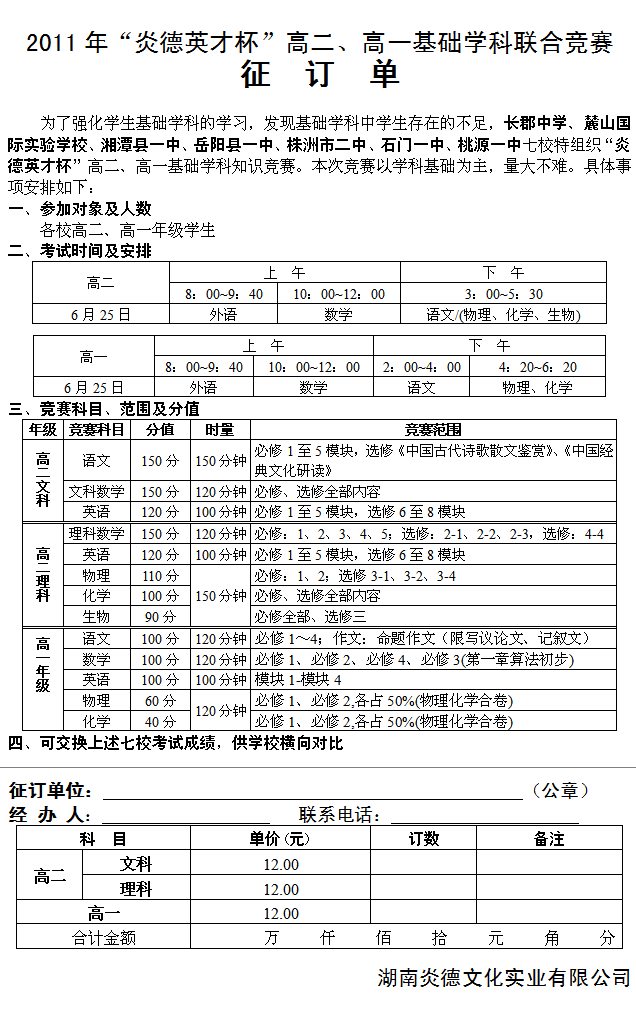 2011“炎德英才杯”高一高二基礎(chǔ)學(xué)科聯(lián)合競(jìng)賽的征訂單