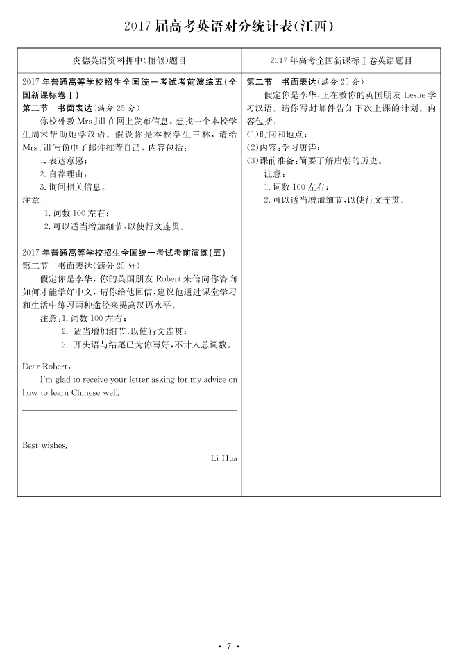 2017高考全國(guó)新課標(biāo)卷Ⅰ對(duì)分表-英語(yǔ)