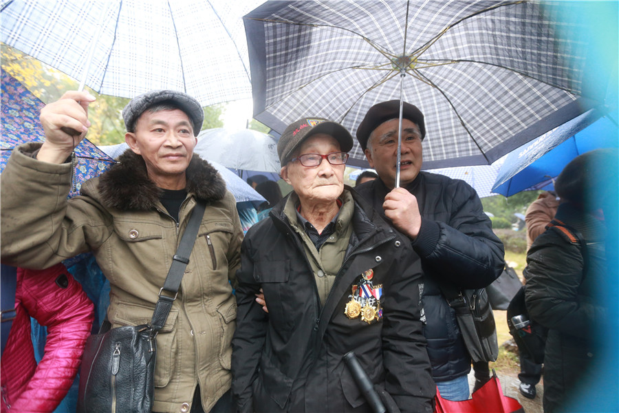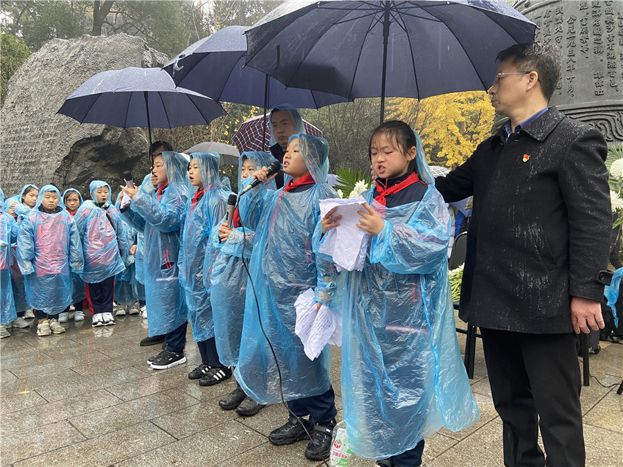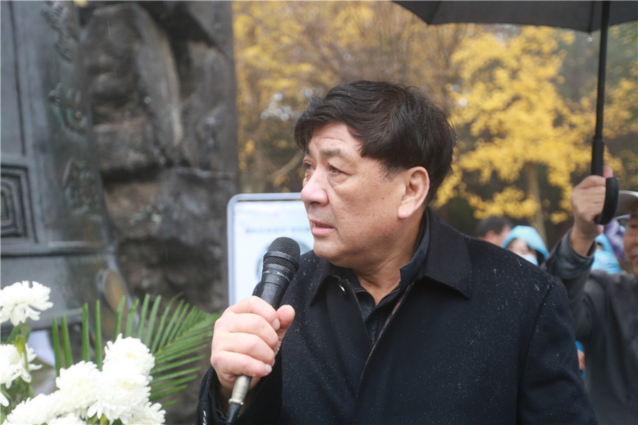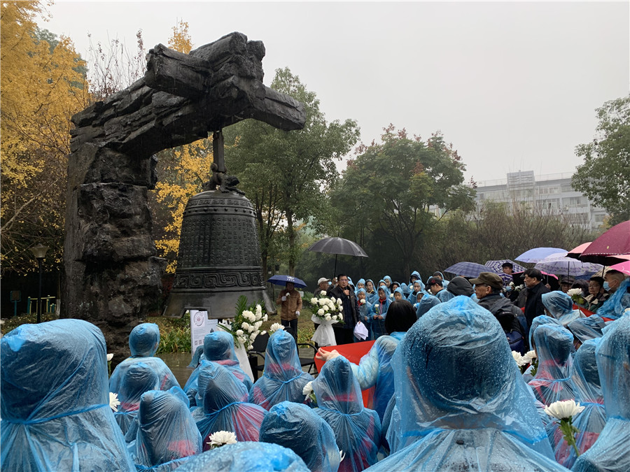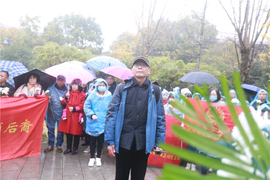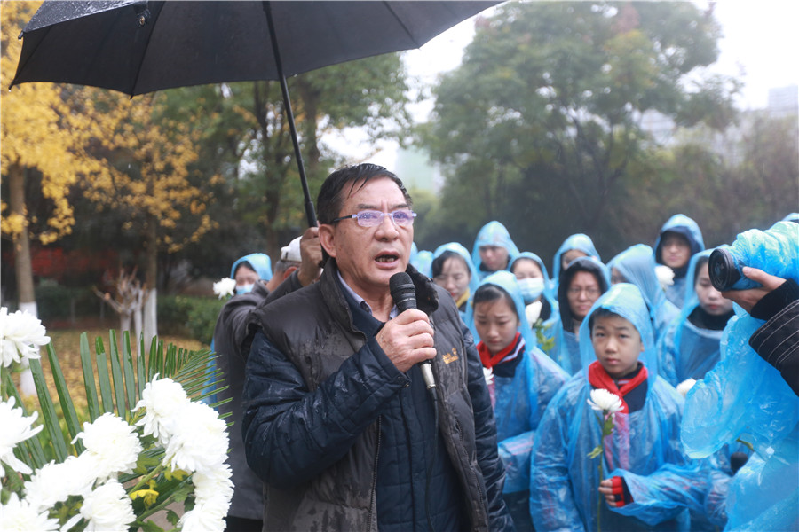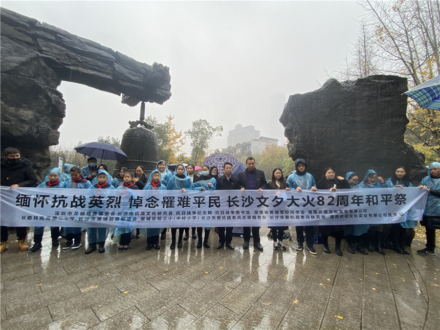 12月13日上午十點(diǎn),長(zhǎng)沙市抗戰(zhàn)文化研究會(huì)發(fā)起的緬懷抗戰(zhàn)英烈和悼念文夕大火罹難平民儀式在天心公園警世鐘下舉行。參加舉辦本次活動(dòng)的還有深圳市龍?jiān)酱壬苹饡?huì)、湖南省黃埔軍校同學(xué)會(huì)、長(zhǎng)沙市黃埔后裔聯(lián)誼會(huì)、長(zhǎng)沙天心閣公園管理處、抗日戰(zhàn)爭(zhēng)紀(jì)念網(wǎng)、抗日戰(zhàn)爭(zhēng)圖書館、星城實(shí)驗(yàn)三小(中嶺小學(xué))、長(zhǎng)郡月亮島第二小學(xué)、長(zhǎng)沙關(guān)愛(ài)抗戰(zhàn)老兵志愿服務(wù)隊(duì)、長(zhǎng)沙關(guān)愛(ài)抗戰(zhàn)老兵秋天班、湖南炎德文化實(shí)業(yè)有限公司、湖南炎德文化實(shí)業(yè)有限公司黨支部。參加活動(dòng)的嘉賓還有原湖南省政協(xié)副主席、中國(guó)國(guó)民黨革命委員會(huì)第十二屆中央委員會(huì)委員劉曉、抗戰(zhàn)老兵陳忠民、房可吉。共有上述舉辦單位的領(lǐng)導(dǎo)、志愿者、學(xué)生、老師、黃埔后裔以及市民共計(jì)三百余人冒雨參加了本次活動(dòng)!