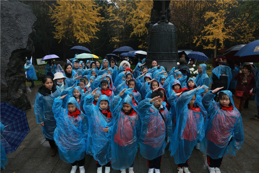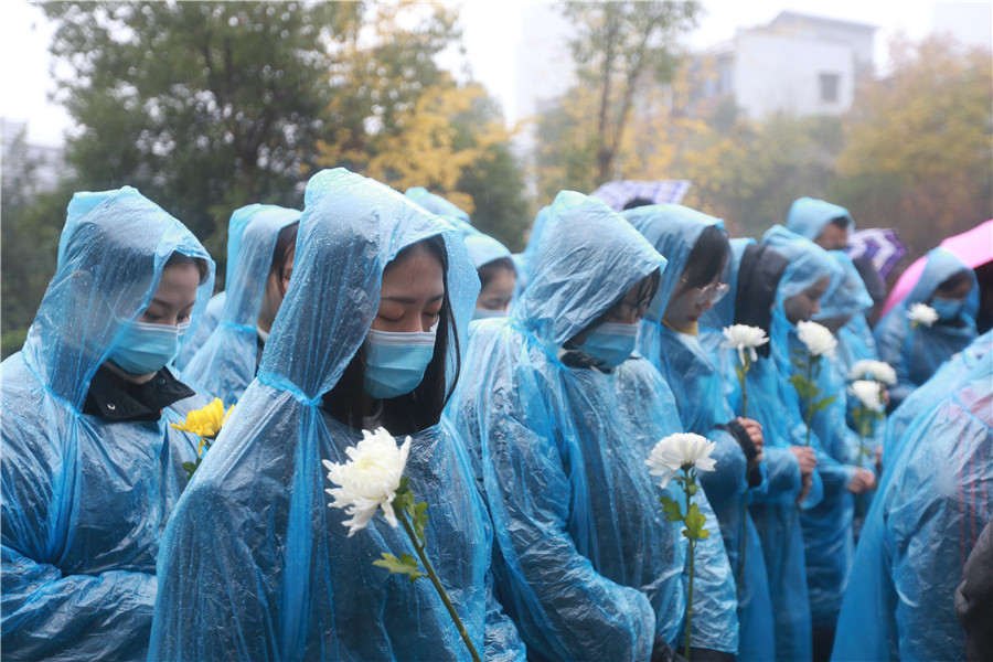 參加活動(dòng)的市民向抗戰(zhàn)英烈和在抗日戰(zhàn)爭(zhēng)中遇難的平民默哀悼念,并獻(xiàn)上白菊表達(dá)哀思。