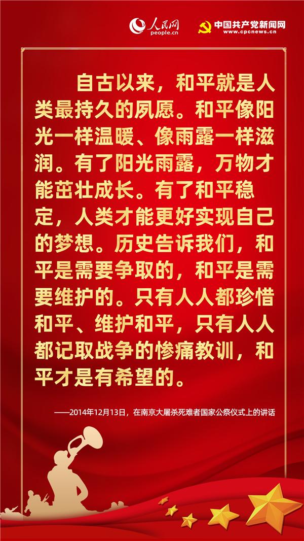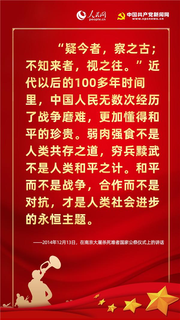 歷史不僅關(guān)乎過去,更關(guān)乎現(xiàn)在和未來。紀(jì)念歷史不是為了咀嚼苦難、延續(xù)仇恨,而是為了重申和平與正義的價(jià)值,從歷史中汲取智慧,獲得開創(chuàng)未來的精神力量。在七七事變83周年的今天,人民網(wǎng)·中國共產(chǎn)黨新聞網(wǎng)梳理十八大以來習(xí)近平總書記有關(guān)“戰(zhàn)爭與和平”的重要論述,讓我們一起“銘記歷史、緬懷先烈、珍視和平、警示未來”。
