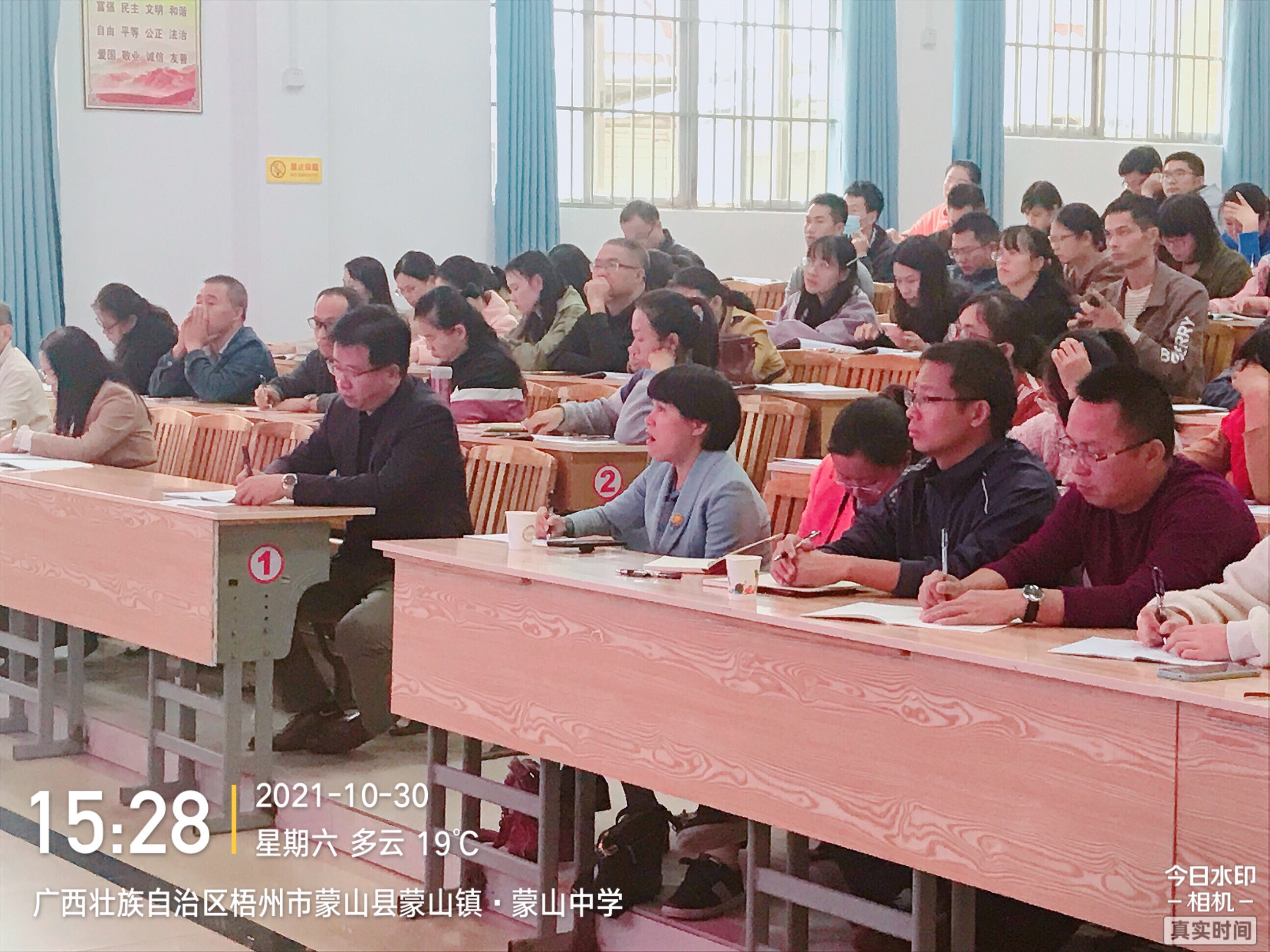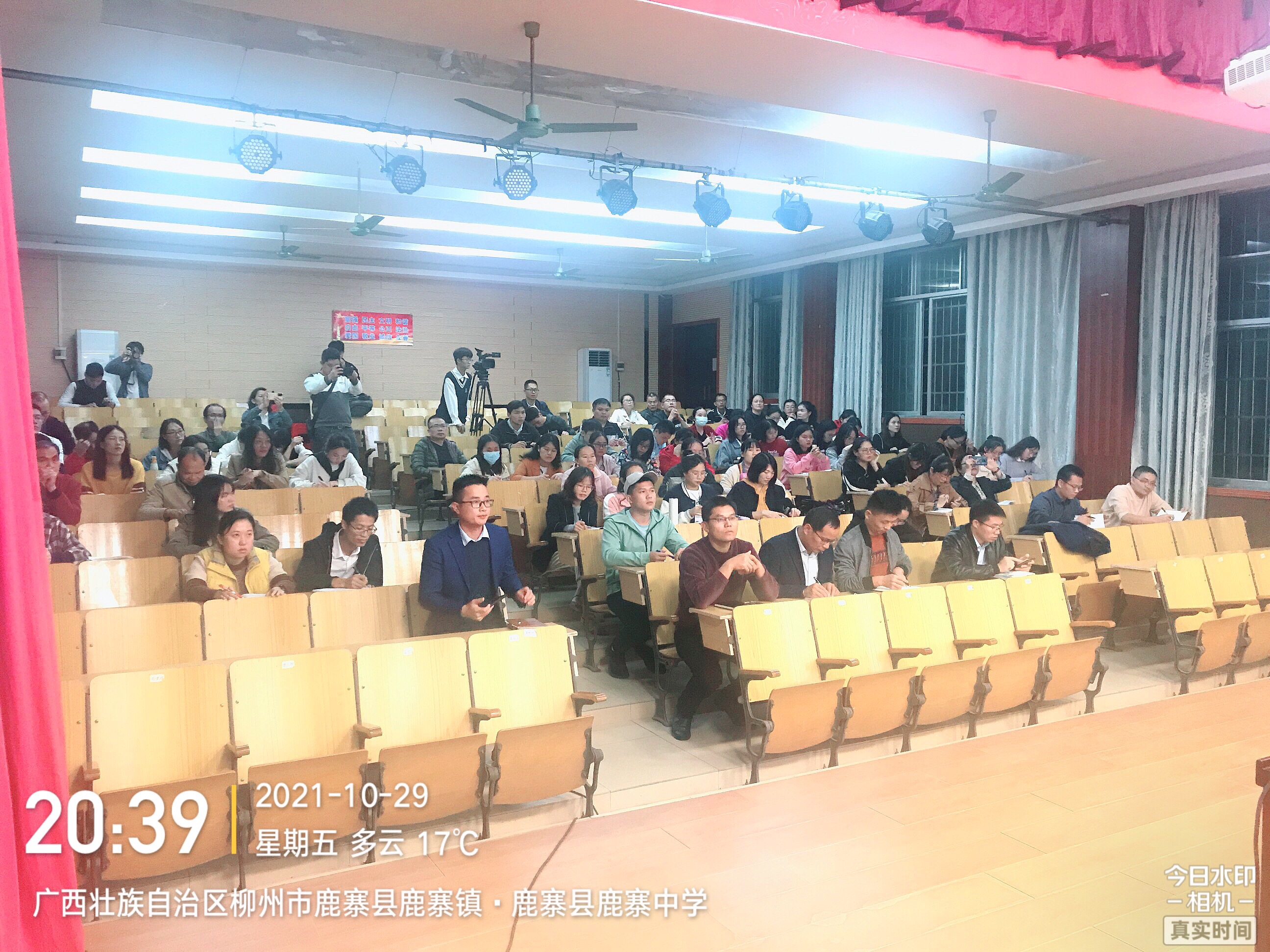 鹿寨中學(xué)全校80多名高一老師認真聽課,做筆記。