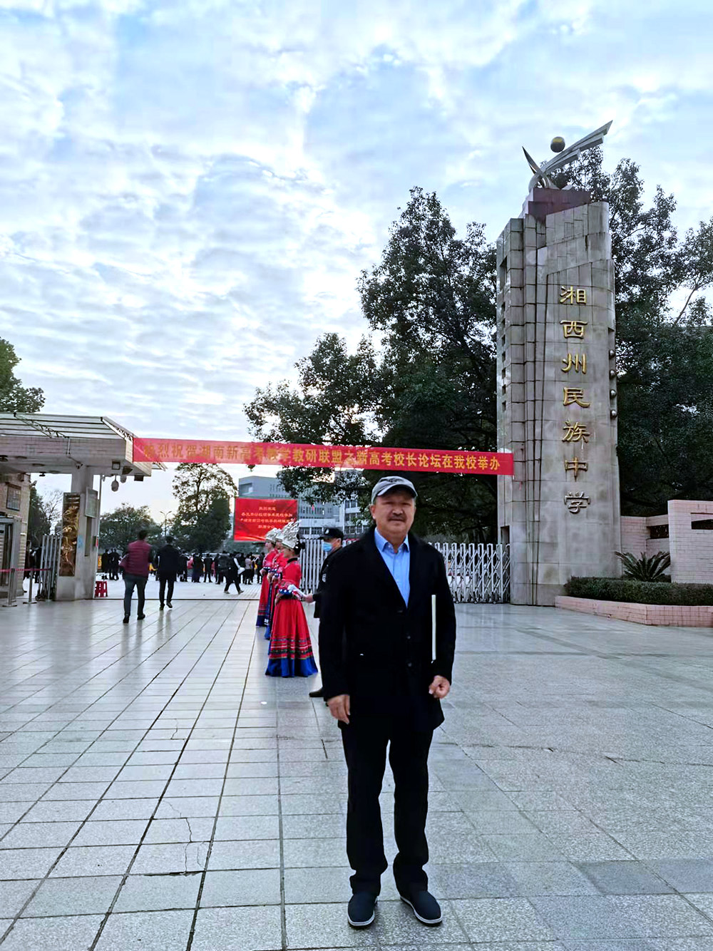 炎德文化董事長何譽軍先生在湘西州民族中學(xué)校門前留影